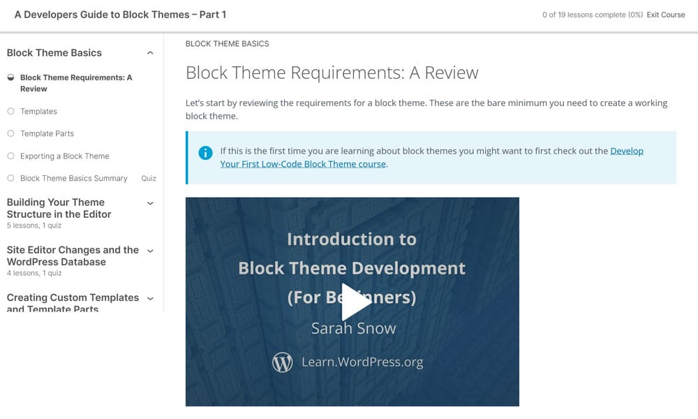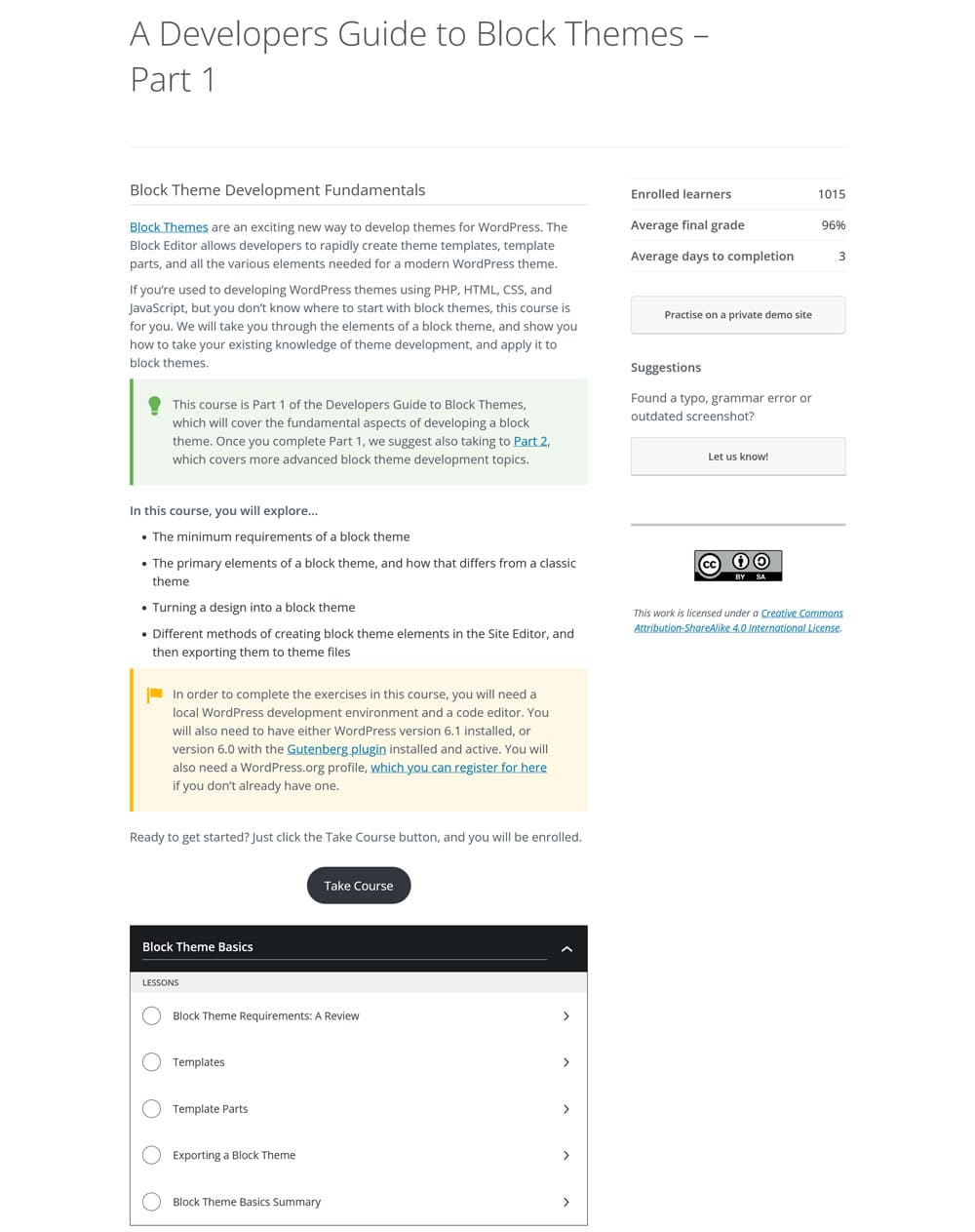 Here, you find a more detailed description and an overview of the course lessons at the bottom. There is also a Practice on a private demo site button. It takes you to a virtually spun-up WordPress website in which can practice what you learn in a sandbox environment.