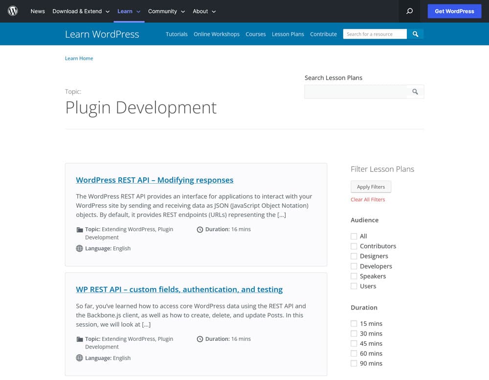 - Topic — Pick the topic you are most interested in, such as block development, CSS, or security.
