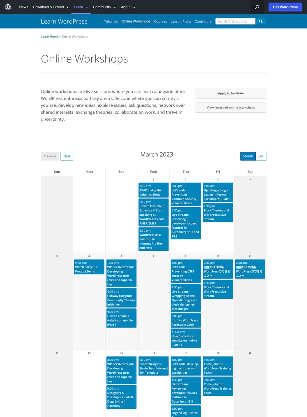 Members of the WordPress community regularly hold online workshops on a variety of topics. The accompanying page lists them in the form of a convenient calendar.
