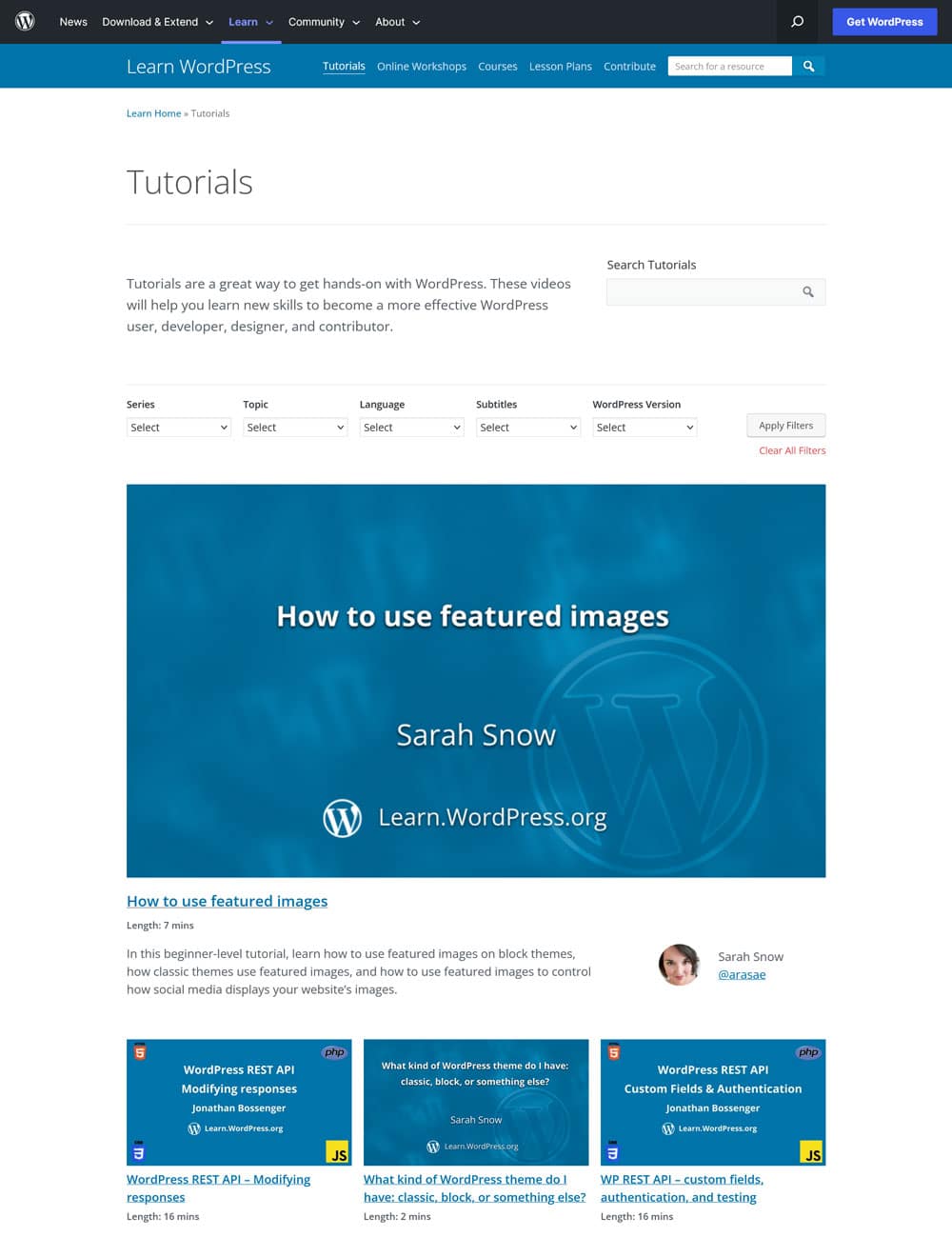 In the Tutorials section, you find video presentations for all sorts of WordPress topics. They range from how to add a site logo to a block theme over migrating your site to another host to using the WordPress REST API.