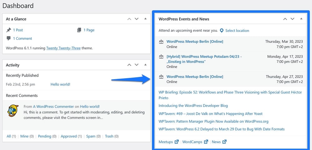 By the way, you can also find information about upcoming local events in the WordPress dashboard. Unless you have removed it via the screen options, the WordPress Events and News widget shows you a list of upcoming meetups in your area including clickable links for more information.