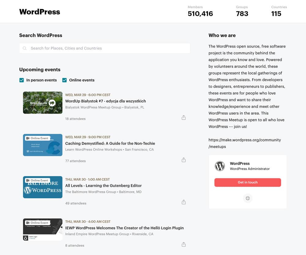 These groups and events is where you can find others who are interested in WordPress, build contacts, ask questions, share your experience, and find help. It especially makes sense to look into local groups that meet in real-life. Face-to-face is often much easier to really get to know people and find more direct support.