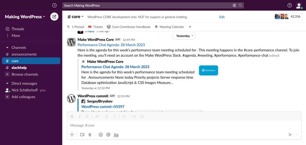 However, if you want to become part of the WordPress project and contribute to it, Slack is where the real-time communication for all of that happens. The channel has channels for the different areas and topics, from core development over polyglots to marketing. There are also channels for WordCamps.