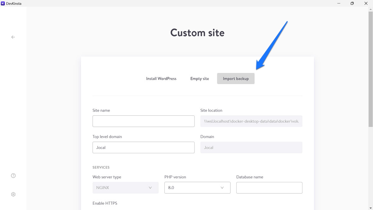 Importing sites manually works similarly. When creating a new site, choose Custom site, then switch to the Import backup tab.