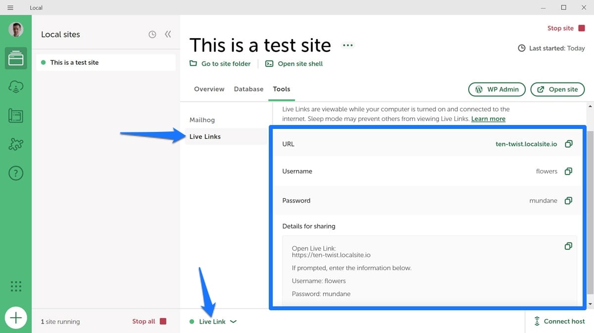 Finally, Tools gives you access to MailHog (to test email sending from your local site) and Live Links, an option we will talk further about below.