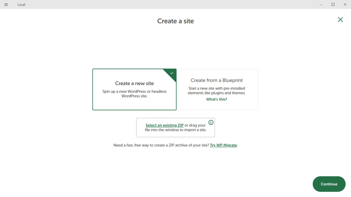 Choose Create a new site (we’ll talk about the other two options soon) and then click Continue.
