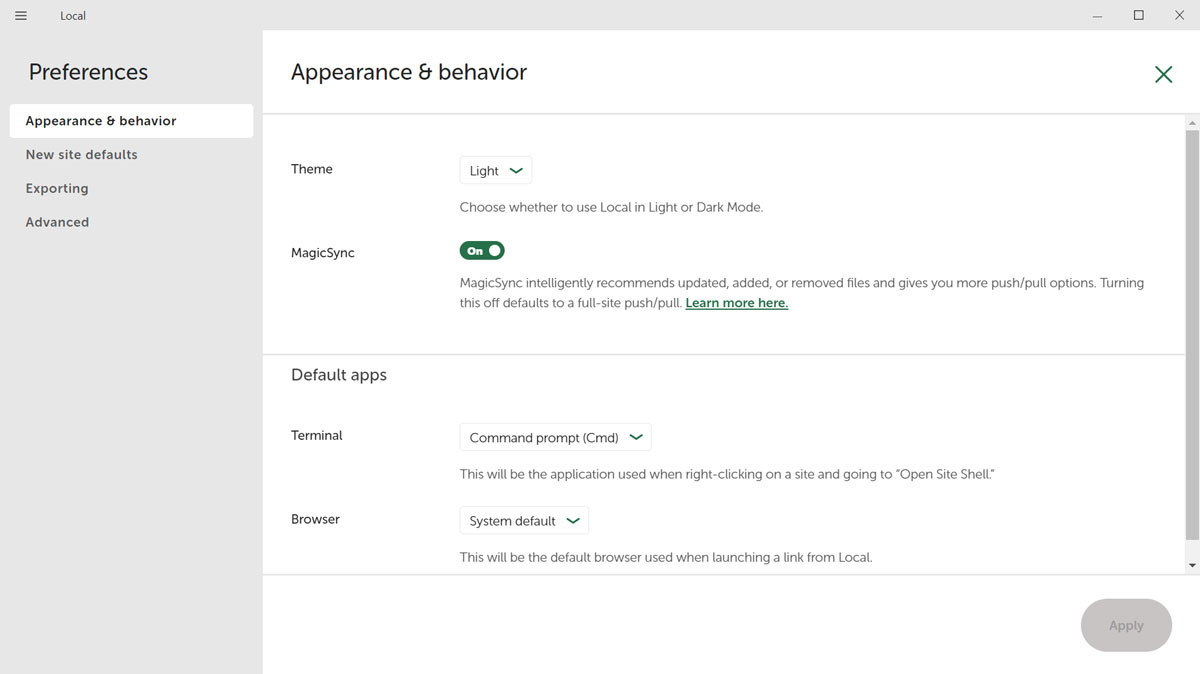 You get to the Local settings via the main menu at the top and then choosing Preferences. It has a number of settings to customize it to your needs such as switching between a light and dark theme and setting up defaults for the shell, browser, and new site configurations you want to use.